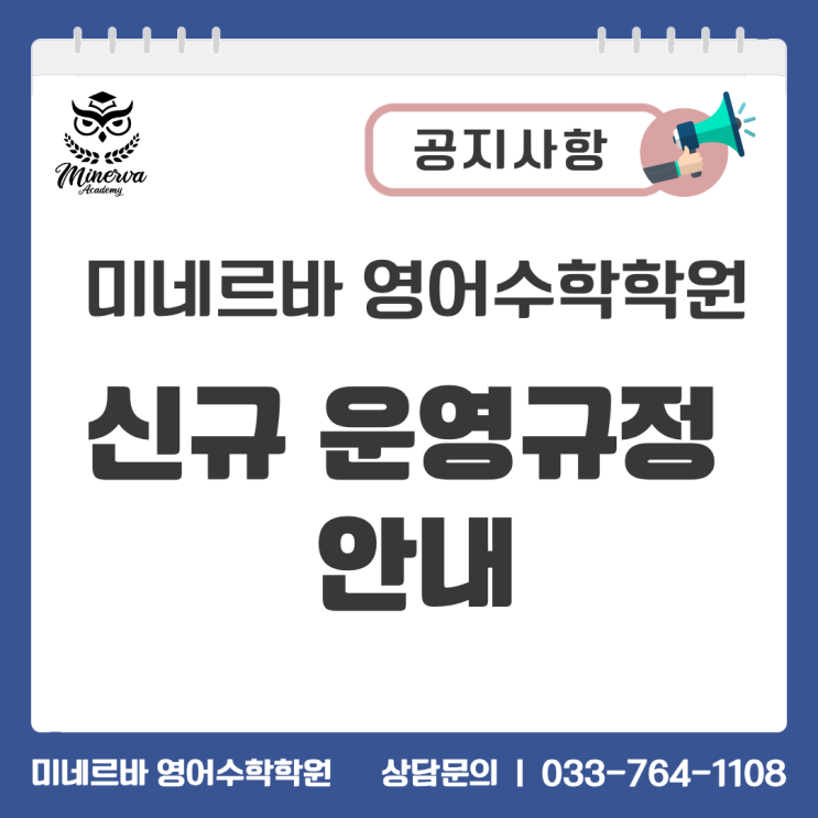 테스트 · 대기자 · 반이동 관련 규정 적용 시점 2026년 5월 1일(금)부터 시행 안녕하세요, 책임교육을 지향하는 미네르바 영어수학학원입니다. 저희 학원의 교육방향을 믿어주시는 학부모님과 학생 여러분께 늘 감사드립니다. 보다 체계적이고 공정한 학원 운영을 위해 아래와 같이 신규 규정을 안내드리며, 2026년 5월 1일부터 시행됩니다. 자주 문의 주시는 내용을 중심으로 정리하였으니 꼼꼼히 살펴봐 주시기 바랍니다 01. 신규 입반 테스트 안내 Q. 테스트 신청은 어떻게 하나요? 테스트는 사전 예약제로 운영됩니다. 학원 방문, 전화 문의, 또는 네이버 플레이스 예약을 통해 신청하실 수 있으며, 평일 오후 2시부터 8시 사이에 응시 가능....... <img src="https://blogthumb.pstatic.net/MjAyNjA0MzBfNzAg/MDAxNzc3NTI3MjQ3NzEz.kt3s4h-aSxYK5_IbYbBm-yV5hv2gkAK_MBgnVtiPq9gg.mFv2kfz4JzJ7EtGT9z6wBiQT3gYIJBtkn14RiFgPtrog.PNG/%B0%F8%C1%F6%BF%EB_%BA%ED%B7%CE%B1%D7_%BE%E7%BD%C4_%285%29.png?type=s3" />