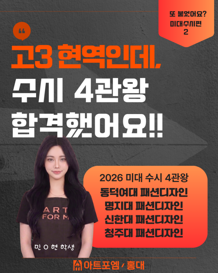 또 붙었어요? 미대수시편! (고3 현역에 그 어렵다는 미대수시 4관왕 이야기) 홍대미술학원 홍대아트포엠에서 만든 결과입니다 요즘 상담을 하다 보면 가장 많이 듣는 질문이 있습니다. "고3 현역으로 미대수시 합격이 가능한가요?" 결론부터 말씀드리면 "홍대아트포엠은 가능합니다." 그리고 실제로 [홍대미술학원] 홍대아트포엠에서는 그 결과가 만들어졌습니다. --- 고3현역 2026 미대수시 4관왕 패션디자인과 4개 대학 동시 합격 이번 주인공은 고3 현역으로 미대수시에 도전한 학생이었습니다. 결과는 단순 합격이 아니라 4관왕 합격이었습니다. 고3현역 2026 미대수시 합격 결과 동덕여대 패션디자인과 합격 명지대 패....... <img src="https://blogthumb.pstatic.net/MjAyNjA0MjlfMTE3/MDAxNzc3NDUwNjkxMzE5.teXxeRQEGi31L0aTY1KSjeDW9geOuWlXy7IDoBqqo1Mg.JEXV6dmFB8Lz1E860g2obx83QV45DKO2_JUC1XtFwGsg.PNG/900%A3%DF1777208672607.png?type=s3" />