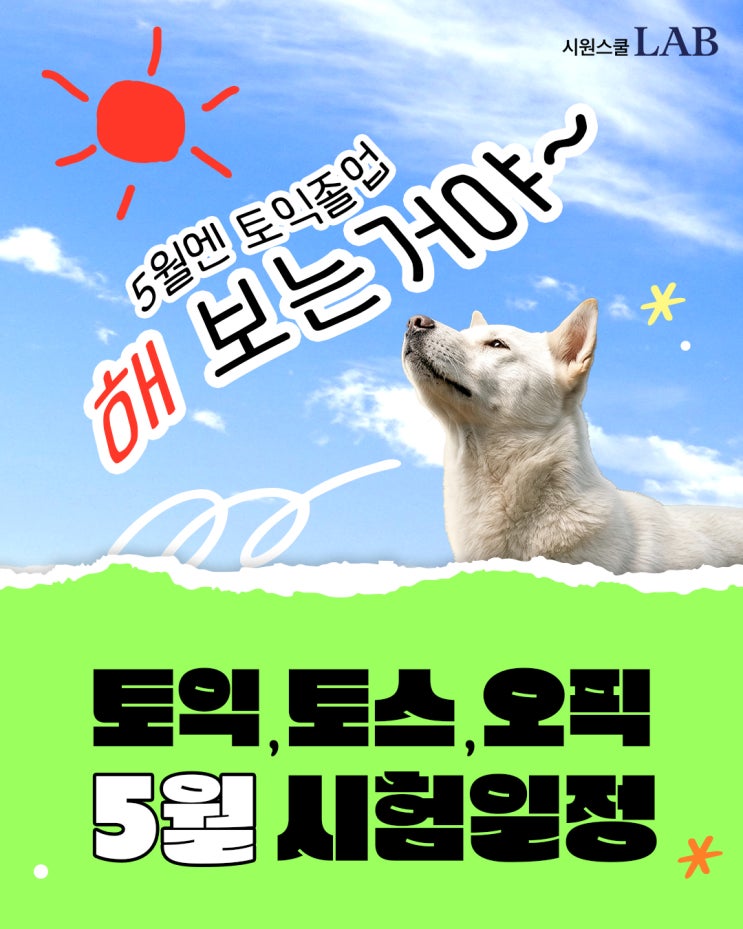 안녕하세요, 시원스쿨랩입니다! 상반기 취업 시즌이 본격적으로 시작되면서 5월토익, 토익스피킹, 오픽 일정을 찾는 분들이 많아지고 있어요~ 오늘은 2026년 5월 시험 일정을 토익·토익스피킹·오픽까지 한 번에 정리해드릴게요! 접수 마감 전에 꼭 확인하시고 미리 챙겨두세요✔️ 2026년 5월토익 일정 5월토익 시험은 두 회차가 예정되어 있습니다. 1회차 — 5월 10일(일) 시험일 : 2026년 5월 10일(일) 오전 9시 20분 접수기간 : 2026년 4월 29일(수) ~ 5월 7일(목) 성적발표 : 2026년 5월 19일(화) 12:00 2회차 — 5월 31일(일) 시험일 : 2026년 5월 31일(일) 오전 9시 20분 접수기간 : 2026년 4월 13일(월) ~ 5월 18일(월) 성적발표 : 2....... <img src="https://blogthumb.pstatic.net/MjAyNjA0MjlfMjEg/MDAxNzc3NDI4NDg2NDk0.eQnAn5Xvfu3-Cd5X9dyYcK94vQW6hSIxsvhOaU_oCjsg.DmjkwwVJSOGRs-GxKjjyMQKO4r5FTDk521BE_XaD0mMg.JPEG/1080x1350_1.jpg?type=s3" />