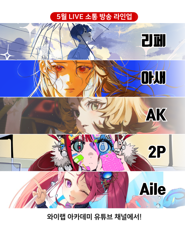 와이랩 아카데미에서는 매주 현업에서 활동하시는 전문가, 작가님들을 모시고 다양한 주제로 소통방송을 진행하고 있습니다 :) 실시간 소통과 노하우, 그리고 업계 이야기까지 아낌없이 전해드립니다! 와이랩 아카데미 5월 소통 방송 라인업! 5월 2일 (토) 7시 30분 리페 그림 소통 방송 - 5월 11일 (월) 7시 아새 그림 소통 방송 - 5월 17일 (일) 7시 30분 AK 그림 소통 방송 - 5월 23일 (토) 7시 2P 그림 소통 방송 - 5월 30일 (토) 7시 Aile 그림 소통 방송 - 와이랩 아카데미 유튜브 채널에서 함께해요 구독, 알림 설정도 잊지 마세요 <img src="https://blogthumb.pstatic.net/MjAyNjA0MjlfNTMg/MDAxNzc3NDQxMDAyNTcx.-qCjVbrVRpvXfFlw8OHXAeaMXjRdr3ZMcnPHvuTMImAg.BoHaBCMzEgEA6cpr5wIxPsPt8kPNGr9QKBiuM9XoopQg.PNG/5%BF%F9_%BC%D2%C5%EB%B9%E6%BC%DB%B6%F3%C0%CE%BE%F7_SNS.png?type=s3" />