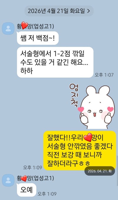 안녕하세요~ 1등국신천안국어학원입니다. 2026년 1학기 1회고사가 시작되었습니다 거의 대부분의 학생들이 다음 주에 시험을 보지만 이번 주에 먼저 시작한 학생들의 가채점 결과를 알려드립니다 멘탈 관리를 위해 시험 다 끝나고 채점한다고 아직 채점하지 않은 학생들도 있어서 먼저 채점하고 연락 온 친구들부터 점수 올릴게요 4월 21일 (화) 국어시험 본 업성고 두정고 학생들 정말 수고했어요 치열하게 준비한 만큼 자기 실력을 제대로 보여준 학생들도 있고 다 맞을 수 있었는데 아쉽게 틀린 학생들도 있지만 끝날 때까지 끝난 게 아니니까ㅎㅎ 남은 다른 과목 시험도 파이팅 합시다!! <업성고 1학년> * 황 0망 : 100점 *신0윤: 94.8....... <img src="https://blogthumb.pstatic.net/MjAyNjA0MjFfMTUy/MDAxNzc2NzU5NTIxMTM2.Ld5G2gAmJqnxNgMzoudahK3K75BB8-0KDXacpgrwR7og.53YEWZdbqXuBVUEFd683fraOUO0JRTZ0K5UkQgFWLhog.JPEG/KakaoTalk_20260421_170540877.jpg?type=s3" />