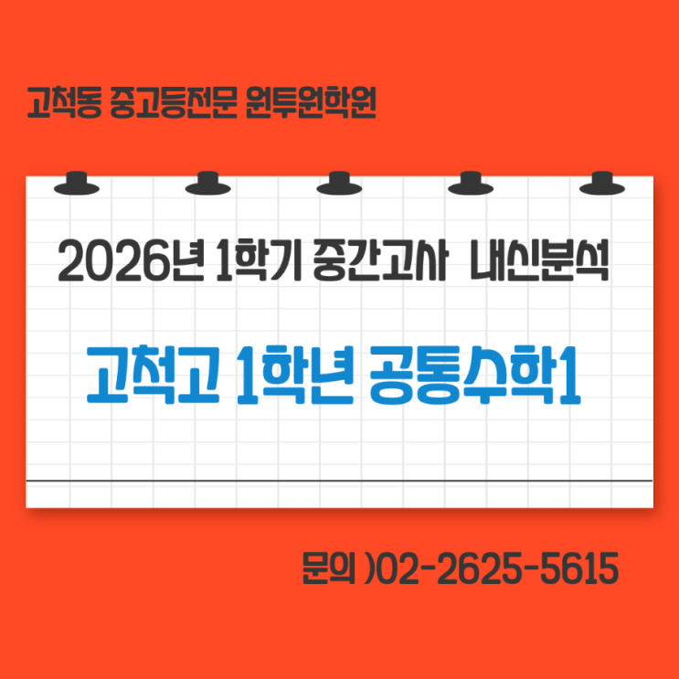 공통수학1 내신분석입니다 1. 시험범위 : (다항식의 연산 ~ 이차함수) 2. 총 문제수 22문제 (객관식 20문제, 서술형 2문제) 총평 : 이번 시험은 각 파트들에서 비슷한 비율로 출제되었습니다. 단원들이 서로 연결되는 내용들이 많아서 파트 하나라도 소홀하거나 개념에 빈틈이 있다면 난이도가 높게 느껴졌을 것입니다. 문제들은 기본 개념에 충실하게 입각하여 그에 대한 적용들을 요구하는 것들이 대부분이었으며, 문제 풀이시 실수를 줄이는 것이 중요했습니다. 평소 수업에서도 개념을 문제에 적용하는 방법들에 대해서 세세하게 다뤘던 만큼 그에 대한 중요성이 드러난 시험이었습니다. 원투원학원 고척고 1학년 수학은 재원생 모두1~ 2등급....... <img src="https://blogthumb.pstatic.net/MjAyNjA0MjZfMTEy/MDAxNzc3MTc0NjcxNjc5.tUmrctkyJtGVzLODylLDW8UweGrXk_dt93FfOmZF4wwg.H7WXwDRQZJB5mN_TY_yRO7ZMHexqGN1eTajODCWCFPsg.PNG/900_%C1%A6%B8%F1%C0%BB_%C0%D4%B7%C2%C7%D8%C1%D6%BC%BC%BF%E4-22.png?type=s3" />