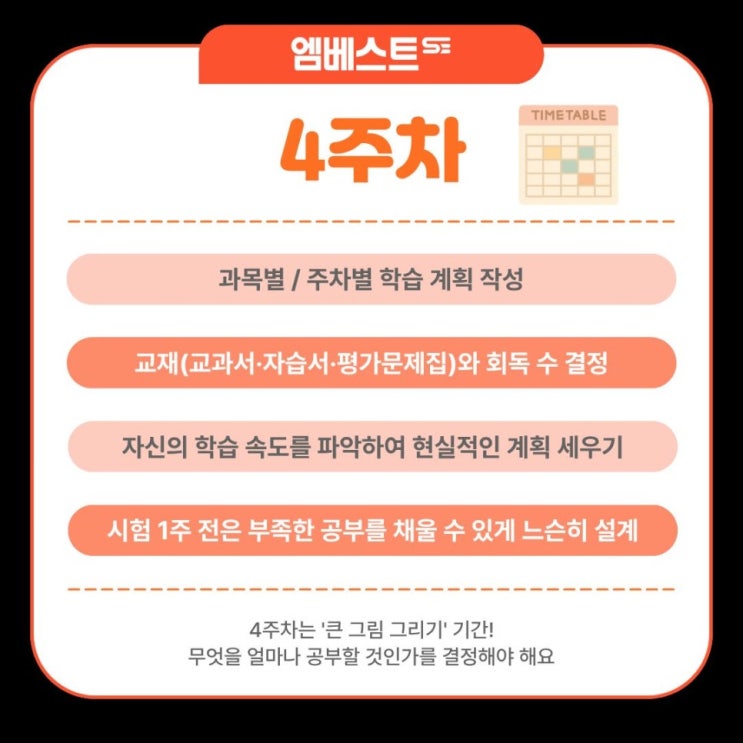안녕하세요 엠베스트학원입니다. 개학이 얼마 지나지 않았는데 벌써 중간고사가 다가오고 있어요. 중학교 시험은 단순히 점수를 잘 받는 것이 목적이 아니라 나에게 맞는 최적의 공부법을 찾아가는 것이 중요합니다. 시험을 통해 어떤 공부 방법이 나에게 효율적인지 확인하고 수정해 나가야 고등학교 진학 이후 완전한 자기주도학습을 할 수 있기 때문이죠. 시험 준비는 벼락치기가 아닌 단계적 접근이 핵심이에요. 시험 전 무엇을 어떻게 준비할 지 주차별 계획의 역할과 중요점을 살펴보아요. 워밍업 자신의 학습 리듬을 파악하는 것이 중요해요. 학교진도를 잘 따라가면서 교과서와 필기 내용을 천천히 1회독하고, 핵심 단어와 선생님의 추가....... <img src="https://blogthumb.pstatic.net/MjAyNjA0MjdfOTUg/MDAxNzc3Mjc0NDc1NjU0.DA5pr89L-pgKzFRGQUIy37aPvKaLTJU_N7bEOEy7Ngog.tFTFdGZfzlUSCj6JYQBAM7XItONwYrxD7jbzfyTVJ1wg.JPEG/wndrks3.jpg?type=s3" />