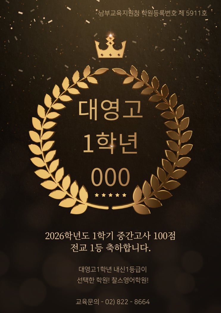 [대영고영어학원][대영고영어전문학원] 2026년 대영고 1학년 1학기 중간고사 100점, 전교1등^^
