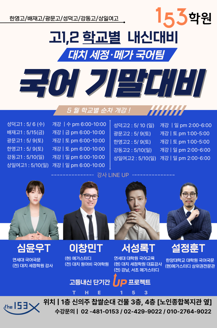 [153학원] 고1·고2 학교별 맞춤 국어 기말 대비 한영고 / 배재고 / 광문고 / 성덕고 / 강동고 / 상일여고 학교별 내신 출제 스타일 완벽 분석 시험 범위 맞춤 커리큘럼 진행 왜 153 국어팀인가 대치·세정·메가스터디 출신 강사진 직강 아는 것에서 끝나는 것이 아니라 점수로 이어지는 수업 2등급 목표 기초부터 다시 잡는 스파르타 시스템 단순 설명이 아니라 이해 → 적용 → 실전 문제 → 서술형 완성까지 반복합니다. 5월 학교별 순차 개강 (기말 대비 시작) 고1 성덕고1 : 5/6 (수) pm 6:00~10:00 배재고1 : 5/15 (금) pm 6:00~10:00 광문고1 : 5/9 (토) pm 6:00~10:00 한영고1 : 5/9 (토) pm 6:00~10:00 강동고1 : 5/10 (일) pm 6:00~10:00....... <img src="https://blogthumb.pstatic.net/MjAyNjA0MzBfMjQ2/MDAxNzc3NTQ3NjczNDk5.-B7cib_1gEEY9PiJ-oiG8asUHG-EXy55_nXukP9liMwg.JXN5j6VlodbOXagnIKiQYJ3fgo81jgWb2rdXlZnlXoQg.PNG/KakaoTalk_20260430_141806285.png?type=s3" />