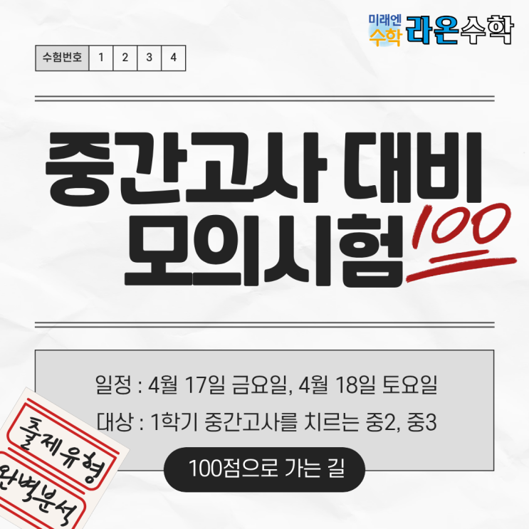 안녕하세요~ 미래엔 남악 라온 수학 학원 윤정쌤입니다. 어느새 벚꽃도 지고 푸른잎이 돋아가며 포근한 날씨가 이어지네요. 우리 미래엔 남악 라온 수학 학원은 26년도 1학기 첫 시험을 준비하는 학생들의 열기로 학원 내부는 더 따뜻하게 느껴집니다^^ 이제 중간고사가 열흘 남짓 앞으로 다가왔는데요, 약점은 보완하고 실전 감각은 극대화하는 시간을 보내고있는 우리 친구들! 개념을 복습하고 다양한 유형의 문제를 풀며 자주 틀리는 오답문제들을 모아 분석하고 기출문제들을 풀면서 실전감각을 익히고 있습니다. 학습이 어느 정도 마무리된 친구들을 대상으로 이번 주 금요일과 토요일을 활용해 "미래엔 전국 중간고사"에 응시할....... <img src="https://blogthumb.pstatic.net/MjAyNjA0MTVfMyAg/MDAxNzc2MjM1OTY3MzI5.8tmw9YQR-dqcV9jRk939lZsPFIj5FASZJILFfw5Y4fkg.Oo26DkKe0TBEgea1fjdez0t4AFjIzcvcIthCau6bCTwg.PNG/%C1%A6%B8%F1%C0%BB_%C0%D4%B7%C2%C7%D8%C1%D6%BC%BC%BF%E4._%2812%29.png?type=s3" />