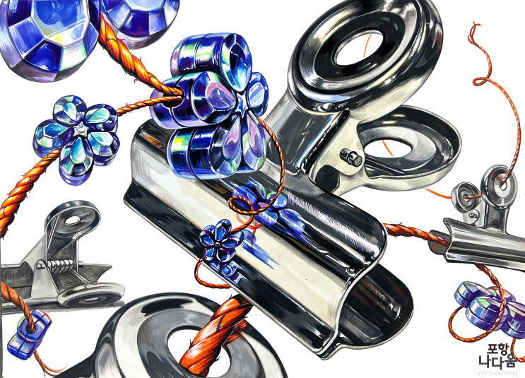 안녕하세요, 포항나다움 미술학원입니다! 지난주에 불독집게와 꽃모양 비즈, 주황색 밧줄로 기초디자인 수업을 했어요. 먼저 선생님의 시범을 보고 학생들도 각자 자신만의 구도를 창작해서 그려보았는데요, 시범 영상을 언제든 다시 볼 수 있도록 편집해서 유튜브에 올려두었답니다. 불독집게는 서로서로 너무 겹쳐서 놓으면 다 칠해놨을 때 정신없이 엉킬 수가 있어서 평소에는 사물을 많이 겹쳐서 그리지만, 이번에는 간격을 두고 그렸어요, 대신 밧줄로 그 사이사이를 연결해주었습니다. 쇠질감 표현 약한 친구들, 불독집게 그려보면서 연습해보세요! #불독집게 #불독집게기초디자인 #비즈기초디자인 #밧줄기초디자인 #기초디자인 #포항나다....... <img src="https://blogthumb.pstatic.net/MjAyNjA0MjBfMTY4/MDAxNzc2Njg3MjUyNDQ1.1bWCiUGAA7bB_89GO6tk81NEhJ8cfFyEufw0gAfpveQg.GXffl3q2tHT-dTRaW_bimVzsscm-k6eCWVnDPRB3Z6Ug.PNG/IMG_4069.png?type=s3" />