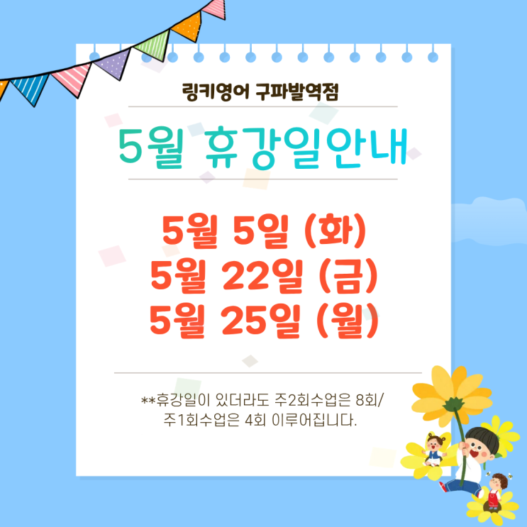 안녕하세요 링키영어 구파발역점 원장 아이린입니다. ‼️휴강일‼️ ✅5월5일 화요일 ✅5월 22일 금요일 ✅5월 25일 월요일 휴강입니다. ‼️5월 1일 금요일 근로자의 날은 정상수업입니다‼️ 또한 어린이날은 기념하여 우리 아이들을 위한 스페셜 클래스가 진행될 예정입니다 ✅(화/목 클래스) 4월 30일 목요일 ✅(금) 5월 1일 금요일 ✅(월/수 클래스) 5월 4일 월요일 입니다. 꼭 수업참여에 차질이 없도록 참고해주세요 <img src="https://blogthumb.pstatic.net/MjAyNjA0MjNfNjQg/MDAxNzc2OTM4MTg5MzQw.5iAFIUbe5tbPL_IpYE3yuO_uxN4taRsk2DcJ6gnnSdUg.yQN5MKjxYZoFvm8rCZqvkGTjnUo3PuWFssvOPNKpeGgg.PNG/1.png?type=s3" />