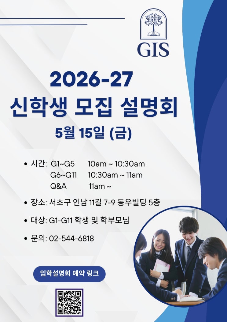 안녕하세요, GIS입니다. 2012년 개교 이래 14년의 전통을 이어온 GIS는 해외 명문 보딩스쿨 및 세계 유수 대학 진학 성과를 꾸준히 만들어오고 있습니다. 아이비리그 및 최상위권 대학에 합격한 학생들은 대부분 GIS에서 장기적으로 함께 성장해온 학생들로, 조기부터 체계적으로 축적된 교육이 최상위권 진학 성과로 이어진다는 것을 보여주고 있습니다. 최근 입시 결과에서도 이러한 흐름이 이어지고 있습니다. GIS에서 7년간 학업을 이어온 학생이 스탠포드 대학교에 합격하였으며, 9년간 함께한 학생은 조지타운 대학교에 입학, 또한 3년간 집중적으로 준비한 학생은 존스홉킨스 대학교에 합격하는 성과를 이루었습니다. 이는 장기적인 교육....... <img src="https://blogthumb.pstatic.net/MjAyNjA0MjBfMjIg/MDAxNzc2NjQ4OTgyNzU0.94O4wKLW51LeAatNB2FXzELhEMj0H2zrLXDVNm9Xag8g.3zC8B3gIR-lwoS6QzzsSPrXxQ-r80qOwnWLQ3Vprt-gg.JPEG/Blue_and_White_Modern_School_Admission_Poster_%28A4%29_%282%29.jpg?type=s3" />