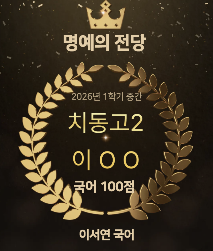 [동탄 이서연국어학원] 치동고2 이ㅇㅇ. 1학기 중간고사 100점!