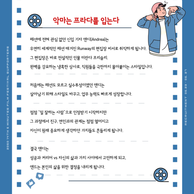 안녕하세요! 동탄 글로벌 어학원입니다~ 4월도 끝자락에 접어들고, 5월 연휴도 다가오면서 연휴 계획 세우시는 분들도 많을 거 같아요~ 연휴 동안 영화 한 편 어떠신가요? 영화 악마는 프라다를 입는다 좋아하시는 분들 많죠? 최근 후속작 제작 이야기가 나오면서 다시 한 번 이 영화가 주목받고 있습니다~ 그래서! 이번 포스팅에서는 ✔ 1편 줄거리 간단 정리 ✔ 실생활에서 바로 쓰는 영어 표현 ✔ 그리고 동탄 글로벌어학원 강좌까지 한 번에 정리해드릴게요 주인공 앤디는 저널리스트를 꿈꾸는 평범한 취준생입니다. 그러다 패션 잡지 ‘런웨이’에 들어가게 되고, 전설적인 편집장 미란다 밑에서 일하게 되죠. 하지만… 이 직장은 상상 이상....... <img src="https://blogthumb.pstatic.net/MjAyNjA0MjVfMyAg/MDAxNzc3MDg2Mjk3Mzg3.UzwKo2UU4DZ64wLXFltXr7U5gKfsGhoVYh5F390yXj4g.rr5l3htbRF-TRRifZlfxm-EBgzqoO6qgsSBuxZNipPYg.PNG/2.png?type=s3" />