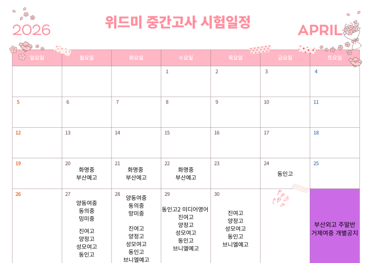 안녕하세요 양정에 위치한 위드미 잉글리시 입니다 오늘로 중고등부 시험이 시작되어서 직전보충으로 더 바쁜 위드미 잉글리시 입니다 중간에 공휴일 지정까지 있어서 학교별 시험 일정 변경이 있었습니다. 위드미 잉글리시 재원생 중간고사 일정입니다 직전보충은 학교별로 개별 공지 나갔습니다 학생들 마지막 시험 대비 마무리와 실력 다지기에 더 집중하는 위드미 잉글리시가 되겠습니다 모든 학생들 이번 첫 중간고사에서 좋은 결과 있기를 바랍니다 ! #양정고 #성모여고 #양정영어학원 #진여고 #동의중 #양동여중 #부산외고주말반 #동인고 #망미중 #양정영어 #동인고시험범위 #양정고시험날짜 #진여고영어 #진여고기출 #성모여고기출 #양정....... <img src="https://blogthumb.pstatic.net/MjAyNjA0MjFfMTY3/MDAxNzc2NzQ3OTkxOTUx.lH45Y6RpicIFCNCn2_P9tsqgJPuUi-jqlu67xl_FJk0g.huqSg5UBWbog4mQ8YP9vymcYnsRMxXRqULigYdz9DEwg.PNG/%C7%CE%C5%A9_%C8%AD%C0%CC%C6%AE_%BD%C9%C7%C3%C7%D1_4%BF%F9_%BA%BD_%BA%A2%B2%C9_%B4%D9%B2%D9_%BF%F9%B0%A3_%B0%E8%C8%B9%C7%A5_%B4%DE%B7%C2_A4.png?type=s3" />
