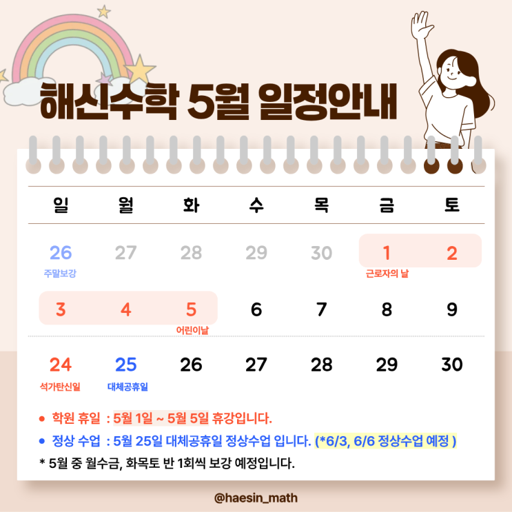 안녕하세요. "시작을 더 쉽게" 해신수학학원입니다. 해신수학은 일주일 내내 아이들의 열정으로 강의실이 후끈하답니다. 시험 막바지라 학교에서 시험 관련 중요한 사항들을 콕 찝어 주고 있어요. 아이들에게 받은 작은 정보도 중요하게 생각하고 학교별 기출분석과 함께 맞춤 대비 중입니다. 첫 시험의 무게를 잘 견디고 다가올 5월 가정의 달 '전략적 휴식'을 가져 봅시다. 중간고사 이후 해신수학 5월 일정 안내드립니다. <학원 휴일> 5월 1일(금) ~ 5월 5일(화) 휴강 5월 6일(수) 정상수업 * 휴무일은 상담 및 문의가 힘드니 참고해 주세요. <정상 수업> 5월 25일(월) 대체공휴일 정상 수업 * 6월 3일, 6월....... <img src="https://blogthumb.pstatic.net/MjAyNjA0MThfMTkz/MDAxNzc2NDkwNjkyNTY4.VT3KaZej0bs9i1ea7foC-xSoQckPOQR81qEEIZBDtmYg.H0TKyLTIlYC8APBViIDt6OyLp_HrBHNWYkLAR4DneNYg.PNG/%C1%A6%B8%F1%C0%BB_%C0%D4%B7%C2%C7%D8%C1%D6%BC%BC%BF%E4._%2833%29.png?type=s3" />
