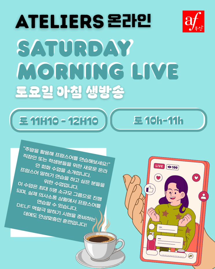 안녕하세요, 부산 알리앙스 프랑세즈는 여러분께 5월부터 시작하는 온라인 아뜰리에 수업을 추천합니다! 주말을 활용해 프랑스어를 연습해보세요! ☕ 일찍 일어나는 분들을 위한 새터데이 모닝 라이브 B1: 토요일 11시 10분부터 12시 10분까지 B2: 토요일 10시 부터 11시까지 소규모 그룹(최대 5명)으로 실제 의사소통 상황에서 프랑스어를 연습해보세요. 구체적이고 생동감 있는 역할극을 통해 DELF 말하기 시험을 준비하기에 이상적인 수업입니다! 더 궁금한 점이 있으시다면 주저하지 마시고 문의주세요! Bonjour, L'Alliance Française de Busan vous propose des nouveaux ateliers de conversation en ligne à partir de ce....... <img src="https://blogthumb.pstatic.net/MjAyNjA0MThfMyAg/MDAxNzc2NDk3MTAxMDMx.42ZkuLoutMMwZMeqV9EfSl4gp9BfLwbvCc51xYP7nnEg.obkmHWSAjkgsRSFi6uXwiR6X02vrscIox-PxDWsUKT8g.PNG/Visuel_de_cours_%281%29.png?type=s3" />