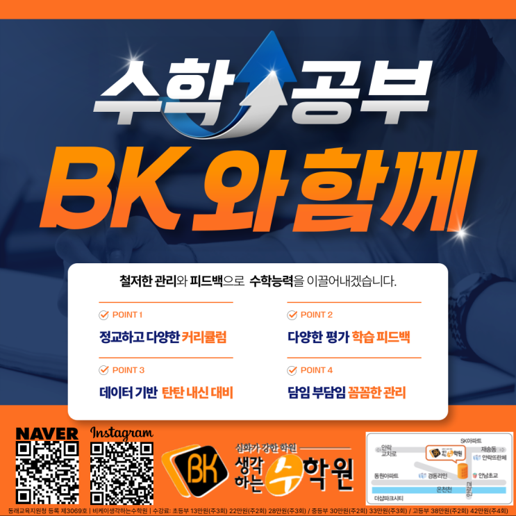 중간고사 이후 수학 실력 업그레이드! 우리 아이 수학 공부 어떻게 해야 할지 고민이신가요? BK생각하는수학학원의 특별한 관리법 안녕하세요! 우리 아이의 수학 성적을 확실하게 이끌어내는 BK 생각하는 수학학원입니다. 중간고사가 마무리된 지금 시기가 가장 중요합니다. 시험 결과를 분석하고 부족한 점을 보완해야 기말고사에서 웃을 수 있기 때문이죠. 기출분석은 아래 임티 클릭!! ↓↓↓↓↓↓↓↓↓↓↓↓↓↓↓ 왜 많은 학부모님이 BK를 선택하시는지, 저희만의 4가지 핵심 포인트를 소개합니다! POINT 1. 정교하고 다양한 커리큘럼 각 학년마다 다양한 과정을 학습하며, 각 반에 맞는 체계적인 커리큘럼을 제공합....... <img src="https://blogthumb.pstatic.net/MjAyNjA0MjNfMjI1/MDAxNzc2OTIzNDAzMTky.bIuCPB65tstc2eaExgf28CiA-yUguqh5j1i6Ulha-mIg.UyE5Vr0IaCo0dXUh-M0NazgvwoBW3gV_AsEYCW6AOhwg.PNG/2026-%EC%A4%91%EA%B0%84%EA%B3%A0%EC%82%AC-%3F%9D%B4%3F%9B%84-%EA%B4%91%EA%B3%A0-001.png?type=s3" />