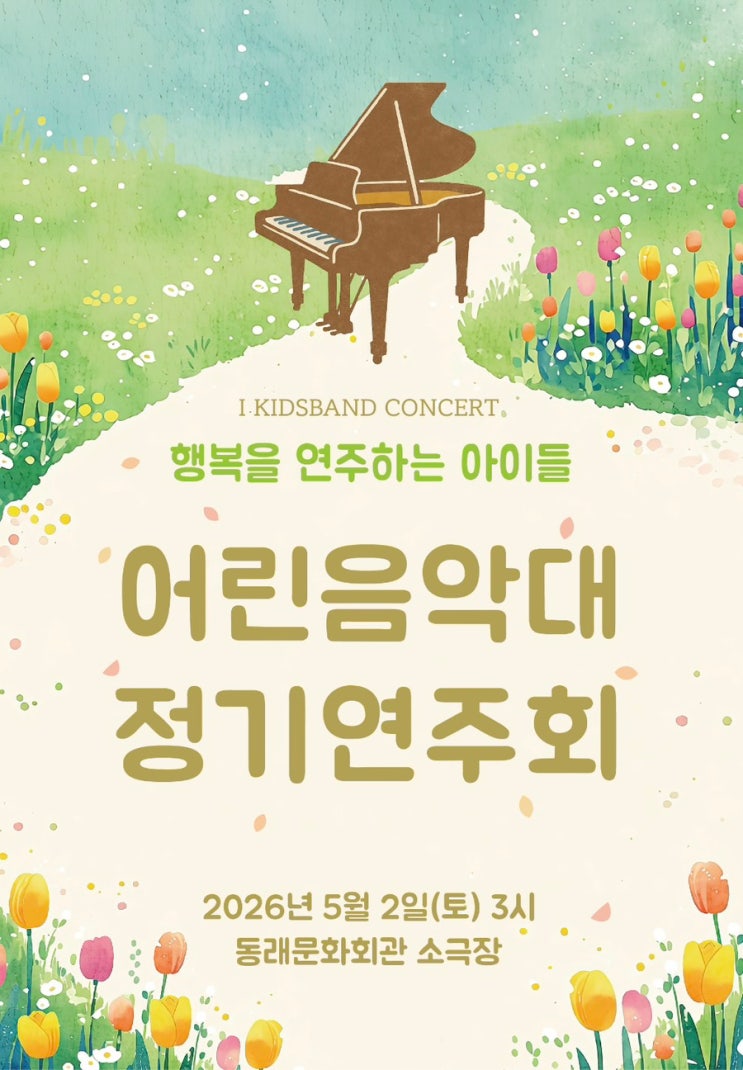 우리 어린음악대친구들이 열심히 준비하고 있는 정기연주회가 5월2일 동래문화회관 소극장에서 열립니다 평가받는 자리가 아닌 연주하는 우리 친구들과 관객들모두 행복해지는 시간이 되길 바라는 마음으로 준비하고 있습니다 새학기에 연주회 준비로 바쁜 우리 친구들 성장의 시간이고 너무 좋은 무대 경험이 될거야 <img src="https://blogthumb.pstatic.net/MjAyNjA0MTlfMjIg/MDAxNzc2NTk5NTQ4Mzk2.fbyXpt2Z4q107VJj5XaWLcWR5sgIdRNvgBqvJk49uosg.mhL1MmRLHzpzGm2eubZJJ-PsjFkIW5aqX_wxkWmdawog.JPEG/IMG%A3%DF5619.jpg?type=s3" />