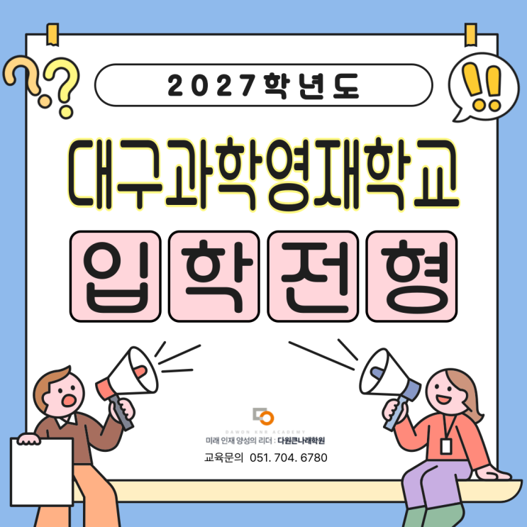안녕하세요. 미래 인재 양성의 리더 다원큰나래학원입니다. 2027학년도 대구과학영재학교 입학전형 안내드립니다. 세부 요강은 아래 학교 홈페이지를 통해 확인 확인하시기 바랍니다. 2027학년도 대구과학영재학교 입학전형 안내 ⬇️⬇️ 대구과학영재학교 입학전형 사이트 바로가기 ⬇️⬇️ 대구과학고등학교 > 입학안내 > 공지사항 상세 <img src="https://blogthumb.pstatic.net/MjAyNjA0MjFfMTQz/MDAxNzc2Nzc1NjA3MDkw.mu1ZApr7DTK3nkFEh65GMW8yEF85K4QfmWhcCjADFDAg.2vVIDJ7qyc2-W0o4g8-Ku3gNFa92YNA9J1Y4jHFWDxsg.PNG/%C1%A6%B8%F1%C0%BB-%C0%D4%B7%C2%C7%D8%C1%D6%BC%BC%BF%E4_-003_%2823%29.png?type=s3" />