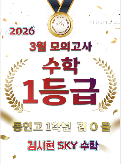 김시현 SKY 수학전문 학원 안녕하세요:) 고등수학 전문 사직동/거제동 대표 수학학원 김시현 SKY 수학전문 학원입니다. 2026년 3월 모의고사에서 최상위 성적을 받은 학생을 소개합니다. 동인고등학교 1학년 김 O 율 학생이 이번 3월 모의고사에서 "수학 전교 1등"이라는 최상위 성적을 거두었습니다. 동인고등학교 1학년 김 O 율 학생이 3월 모의고사에서 "수학 1등급"이라는 최상위 성적을 받았습니다. 동인고등학교 1학년 김 O 율 학생은 중학교 1학년 때부터 꾸준히 김시현 SKY 수학에서 공부하고 있는데요 김시현 SKY 수학에서 그동안 탄탄히 기본기를 다지면서 기본에 충실하며 공부하였는데요 지난 중학교 시험에서도....... <img src="https://blogthumb.pstatic.net/MjAyNjA0MThfMjY0/MDAxNzc2NDg0MTgxMDM4.-javrQGo5ymW-pLKfApMXrGP_nge7GH6K04QNwYjnLgg.579RdxMaYj_maILoHnuriq_jVHVqeNOctsoB3Bdc0wsg.PNG/%B1%E8%C1%F8%C0%B2.png?type=s3" />