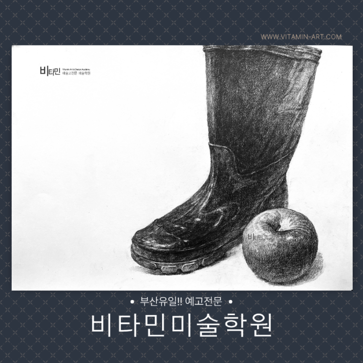 안녕하세요~~ 부산지역 유일!! 예고 전문 입시미술학원 비타민입니다. 오늘은 한국조형 예고 출제 예상 정물 소재 장화 + 사과 정물을 단계적으로 진행과정을 설명하도록 하겠습니다. 한국조형 예고 출제 정물은 앞전 포스팅에서 여러 번 알려 드렸던 내용으로 간단히 요약을 하면 14종의 정물 소재 중 4종의 정물이 최종적으로 출제가 되며 출제가 되는 정물은 실기 시험 2일 전에 학교 홈페이지를 통해 발표가 되니 이점 꼭!! 참고하시기 바랍니다. 오늘 우리가 함께 그림을 그릴 소재는 장화와 사과입니다. 그린을 그리 전 우선적으로 생각을 해야 될 것은 자신이 그리는 소재에 대한 특성의 파악입니다. 소묘는 색상을 사용하지 않는 단일톤....... <img src="https://blogthumb.pstatic.net/MjAyNjA0MTJfODgg/MDAxNzc1OTY5MDk4NDg2.zSHcu8B0UW5FTa-NSACZYLJn0qWDEQc64cP-AkEro5cg.tHAXUbAn-omGxDcthQ_B0xFkxE-AC2sdE9w9v3YBo3Yg.PNG/%C7%A5%C1%F6.png?type=s3" />