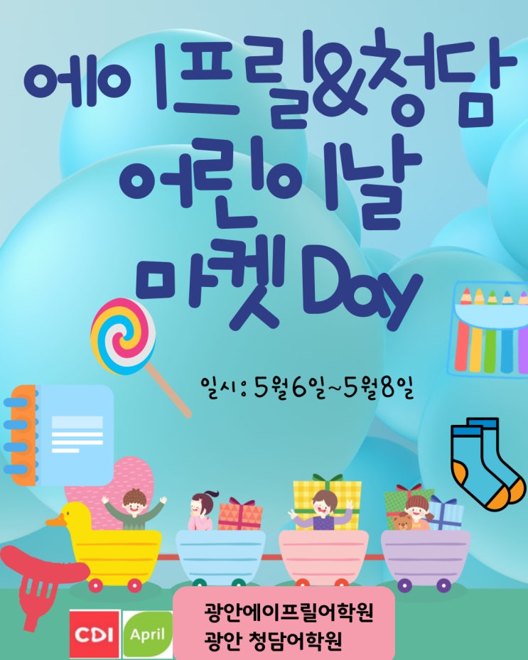 봄 내음이 물씬 나는 4월 만끽 하고 계신가요? 안녕하세요 광안 에이프릴 광안 청담어학원입니다. 5월5일 어린이날을 맞아 "Market Day"가 열립니다. 에이프릴 친구들 부터 ~ 광안청담 어학원 친구들 모두 즐길수 있는 행사로 어린이날을 추억할수 있는 가장 기쁜날 되길 소망합니다 ♥ 일시: 5월6일~5월8일 (정상 수업 진행중에 어린이날 행사가 있습니다:) <img src="https://blogthumb.pstatic.net/MjAyNjA0MTdfMTMx/MDAxNzc2NDIwNTA3ODA1.KXlkfmmA7-_-tqWuI9DBm85Zcit_3zzgz0c3OKTH9dgg.kuPstCD5zgpUnE8NR-1UZzfTtDJIn6ZVl6-aIJ5A8Mkg.JPEG/%B8%B6%C4%CF%B5%A5%C0%CC.jpg?type=s3" />