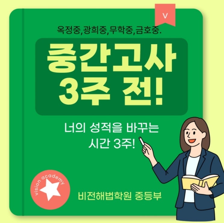 안녕하세요~^^ 옥정중, 광희중, 무학중 친구들의 중간고사가 어느덧 3주 앞으로 다가왔습니다! 중간고사 3주 전, 지금이 가장 중요합니다 .이 시기는 단순히 “열심히 해야지”라고 마음먹는 단계가 아니라, 성적의 방향이 결정되는 가장 중요한 시기이지요. 많은 학생들이 시험 직전에 몰아서 공부하려고 하지만, 중등 시험은 그렇게 준비해서는 원하는 결과를 얻기 어렵습니다. 특히 최근 시험은 암기만으로 해결되지 않고, 이해와 적용 능력을 함께 요구하고 있기 때문입니다. 그럼 각 과목은 어떻게 준비할까요? ✔ 영어 ▶교과서 본문 완벽 암기 ▶서술형 및 변형 문제 대비 ▶단어 + 문장 구조까지 정확히 이해 ✔ 수학 ▶개념 정....... <img src="https://blogthumb.pstatic.net/MjAyNjA0MDhfMTc0/MDAxNzc1NjQxODYyNzkx.uzzsFQWthHdAjkFtSo_MzzJCOKtG8X3wZcetAN8fYtQg.mwdF8b0Ms9OLC3XiGgQoSpGxS2ICca_pZhqJkJ2biLQg.JPEG/900%A3%DFScreenshot%A3%DF20260408%A3%DF184943%A3%DFKakaoTalk.jpg?type=s3" />