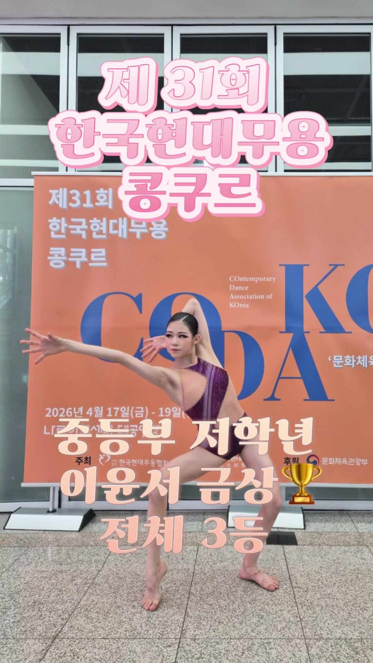 제31회 한국현대무용콩쿠르 이윤서 중등부 저학년 전체 3등 제31회 한국현대무용콩쿠르에서 이윤서 학생이 중등부 저학년 부문 전체 3등을 수상했습니다. 작품 〈Chronos〉로 무대에 선 윤서는 끝까지 집중을 놓지 않고 자신의 흐름을 잘 지켜냈습니다. 과정에서 보여준 태도와 준비가 그대로 결과로 이어진 무대였습니다. 값진 결과 진심으로 축하합니다. 수고 많았습니다 #제31회한국현대무용콩쿠르 #한국현대무용콩쿠르 #이윤서 #중등부저학년 #전체3등 #Chronos #현대무용 #무용콩쿠르 #이화무용아카데미 <img src="https://phinf.pstatic.net/image.nmv/blog_2026_04_21_2119/hU3wxp6N3X_03.jpg?type=f480x480" />