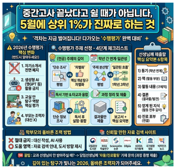 "중간고사 끝나고 잠깐 숨 좀 돌리려고요…" 학부모님께서 시험이 끝난 다음 주 상담에서 가장 많이 하시는 말씀입니다. 충분히 이해됩니다. 아이도 부모님도 한 달 가까이 긴장 속에 살았으니까요. 하지만 정확히 이 시점에서 상위 1% 학생들과 평범한 학생들의 격차가 벌어집니다. 5월은 학교마다 재량휴업일까지 겹쳐 쉬는 날이 유독 많은 달입니다. 이 시간을 "쉬는 시간"으로 쓰느냐 "준비 시간"으로 쓰느냐가 1년 농사를 가릅니다.! 5월에 반드시 해야 할 3가지 학원에서 권하는 5월 핵심 미션은 다음과 같습니다. → 1. 중간고사 이후 수행평가 준비 → 2. 기말고사 선행 학습 → 3. 6월 모의고사 대....... <img src="https://blogthumb.pstatic.net/MjAyNjA0MjVfMjUy/MDAxNzc3MDgwNDE1NDkz.13FuNw66MT6fTqv6Xm2vzA3uLWDaPRMzyoKp_KnOVRAg.zUh7GyHqQUSua0iAPOSgtSwIhjXXEmQkqdCj7MGzxXUg.PNG/image.png?type=s3" />
