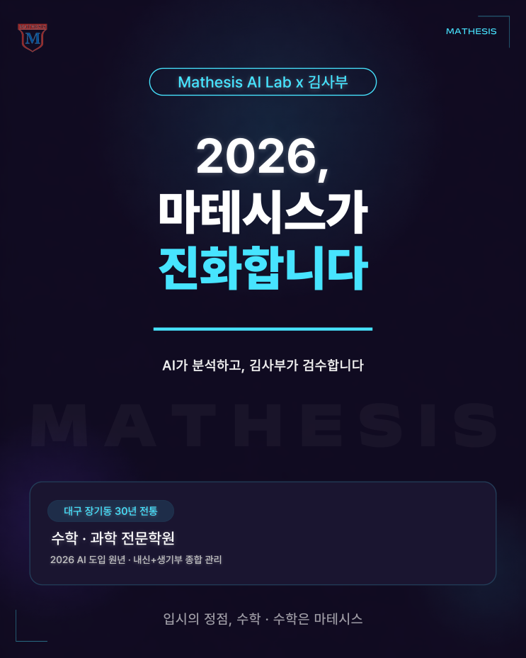 안녕하세요, 대구 장기동 마테시스 학원 김사부입니다. 오늘은 조금 긴 이야기를 시작하려 합니다. 저희 학원이 30년을 지나오며 가장 많이 들었던 학부모님의 한 마디. 그리고 2026년, 마테시스가 그 한 마디에 어떻게 답하려 하는지에 대한 글입니다. 학교 시험을 치고 온 다음 날. "이건 왜 틀렸는지 모르겠어요." 이 말, 한 번쯤 들어보셨을 겁니다. 문제집 해설은 '비슷한 문제'만 풀어줍니다. 정작 내 아이가 푼 학교 시험에는 해설지가 없습니다. 그러니 같은 실수가 다음 시험에서도 반복됩니다. 저희가 30년 동안 가장 자주 마주한 장면이기도 합니다. 그래서 마테시스는 2026년, 이 부분을 본격적으로 손보고 있습....... <img src="https://blogthumb.pstatic.net/MjAyNjA0MjlfMjE0/MDAxNzc3NDU5MTIwMzE0.1c2hqFnLKvBrhds7ADB2t8bmNCq--NSmqR6kot9V6jwg.EirnuFx4-2E92OrRAwtxhVqh82m6bWqTHUu_4ezdt10g.PNG/1.png?type=s3" />