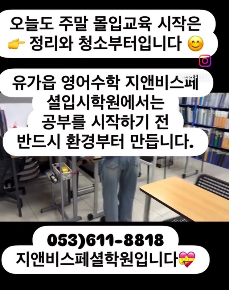 안녕하세요 유가읍 영어수학 지앤비스페셜입시학원입니다. 오늘도 유가읍 영어수학 지앤비스페셜입시학원의 주말 몰입교육은 ‘정리와 청소’로 시작됩니다. 1. 몰입의 시작은 ‘환경 정리’입니다 유가읍 영어수학 지앤비스페셜입시학원에서는 주말 몰입교육이 시작되기 전 가장 먼저 하는 일이 있습니다. ✔ 책상 정리 ✔ 의자 정렬 ✔ 불필요한 물건 정리 ✔ 학습 공간 청소 단순한 준비가 아니라 집중을 만드는 첫 단계입니다. 공부는 앉는 순간 이미 시작됩니다. 2. 청소는 ‘공부의 일부’입니다 유가읍 영어수학 지앤비스페셜입시학원에서는 청소를 단순한 정리가 아니라 학습 태도의 시작으로 봅니다. ✔ 흐트....... <img src="https://blogthumb.pstatic.net/MjAyNjA0MjVfMTA5/MDAxNzc3MTE5MTQxMzUx.Dl0aWBz-gt8l5bp-LwQxYwsItojYNnkXMVPEJX0Jbvcg.3Su_YNmum0wXfwN47BIpz-UxbILs_l-TvQz5TIrIRHUg.JPEG/IMG%A3%DF7841.jpg?type=s3" />