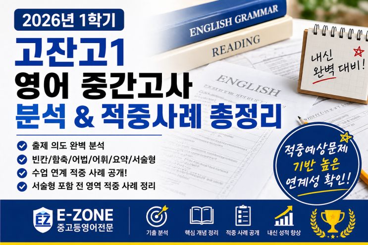 2026년 1학기 고잔고1 영어 중간고사 분석 “단순한 문제 적중을 넘어, 출제 의도와 수업 내용이 전반적으로 잘 맞아떨어진 시험이었습니다.” 안녕하십니까, 이존영어입니다. 오늘 시행된 고잔고1 영어 중간고사 분석과 함께 실제 수업 및 자료에서의 적중 사례를 정리해드립니다. 1. 시험 총평 이번 시험은 한 문장으로 정리하면 “기출 기반 논지 구조형 시험” 난이도는 [ 중상 수준 ] 하지만 단순히 쉬운 시험은 아니었습니다. # 해석이 아니라 ‘논지 구조’를 이해했는지를 묻는 시험 2. 이번 시험의 핵심 학생들이 많이 착각하는 부분이 있습니다. 문제를 많이 풀었다고 해서 점수가 오르는 시험이 아니라 “글의 구조를 이해한 학생만 안....... <img src="https://blogthumb.pstatic.net/MjAyNjA0MjhfMTUx/MDAxNzc3MzYzNTc1MTUx.QtKpQ5R0vxpPi238jibhdtYOdDCcn8EbnGWfIOzhNKsg.nifUqb7QPWgR4l9L1gaadcFbLy3A2O_a1-LjoDr4di0g.PNG/ChatGPT_Image_2026%B3%E2_4%BF%F9_28%C0%CF_%BF%C0%C8%C4_05_05_47.png?type=s3" />