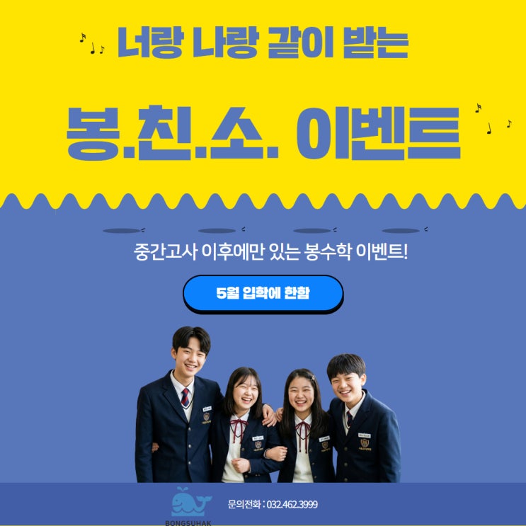 안녕하세요^^ 이제 4월도 정말 3일밖에 남지 않았네요!!! 다들 시험 가열차게 치르느라 정신없는 파이널 주간이 되겠는데요 ^^ 많은 것을 배우고 깨닫고 더욱 단단해져서 학업 열의를 불태우는 그런 의미 있는 중간고사이기를 바래봅니다. 1년에 딱 2번있는 구월동 수학학원 봉수학의 대대적인 이벤트를 소개해 드리겠습니다. 봉수학에 내 친구를 소개합니다. 바로 봉.친.소. 인데요 ^^ 1학기 중간고사와 2학기 중간고사 기간 이후 한달 동안만 진행되는 이벤트입니다. 바로 다니는 재원생이 친구를 봉수학에 소개하는 경우 두 친구 모두 수강료를 5만원씩 할인해주는!!! 정말 대대적인 이벤트인데요. ( 중간에 수강이탈하는 경우에는 해당이 되....... <img src="https://blogthumb.pstatic.net/MjAyNjA0MjhfMTYw/MDAxNzc3MzcyMjE2NTA5.wGqnVmNeQoU8M2Ol5gAWl1UtcO_5tfquemqImmm1cZQg.ZKa5LbTr8w7wlx1G8tcV5pho6SX_kQvUgVTKv5mSsD0g.JPEG/%BA%C0%C4%A3%BC%D2_%281%29.jpg?type=s3" />