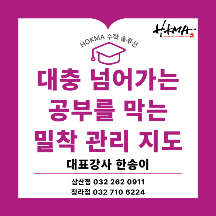 안녕하세요. 부평 수학학원, 호크마수학학원입니다. 아이의 수학 공부를 고민하다 보면 자연스럽게 한 번쯤은 이런 생각이 듭니다. "조금 더 빠르게 진도를 나가야 하는 건 아닐까?" 그래서 진도를 앞서 나가기도 하지만, 정작 시험 결과를 보면 생각만큼의 실력이 나오지 않아 당황하는 경우가 많습니다. 문제는 속도가 아니라, 배운 내용을 제대로 내 것으로 만드는 과정이 빠져 있기 때문입니다. 그래서 오늘은 부평 수학학원 호크마 대표강사 한송이 선생님의 풀이 과정까지 완전히 자기 것으로 만드는 '밀착 관리 솔루션'에 대해 살펴보려고 합니다. Insight "문제도 많이 풀고 있는데, 실력이 쌓이는 느낌이 없어....... <img src="https://blogthumb.pstatic.net/MjAyNjA0MzBfNTEg/MDAxNzc3NTU4NjYzNjk3.aZaB6j5drn7pZ6FPXd6-ZHiipftVr9UgqoExBiFzFNog.KogqfAHArKkIIbzmsEotfrFXlM92NmA-RXT1bLP3K5Ig.PNG/%B9%D0%C2%F8_%B0%FC%B8%AE_%BC%D6%B7%E7%BC%C7_%C7%D1%BC%DB%C0%CCt-001.png?type=s3" />