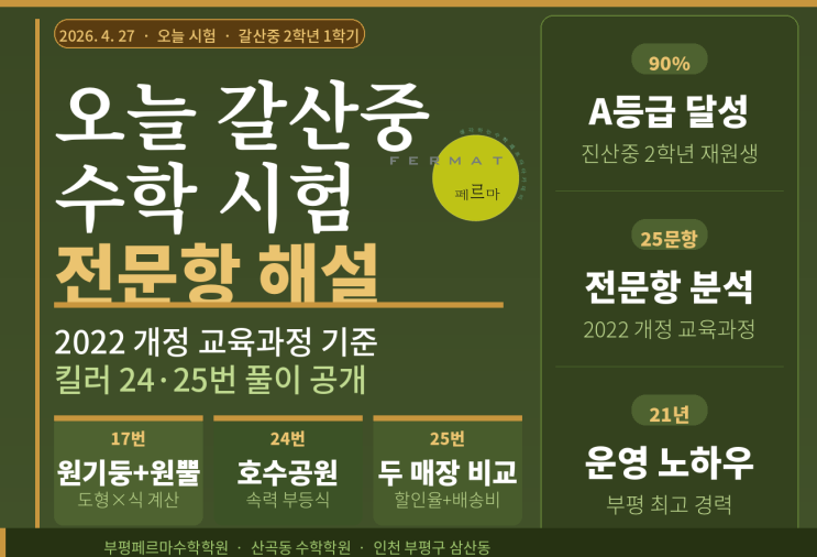 어제 갈산중 2학년 1학기 중간고사가 있었습니다. 시험 보고 돌아온 아이에게 "어땠어?" 물었을 때 이런 말을 했다면 주목해 주세요. 갈산동 수학학원 부평페르마의 결론! 이번 갈산중 중간고사 수학시험은 전체적으로 평이한 수준이었지만, 24번(호수공원 걷기), 25번 (두 온라인 매장 비교) 문제는 실수를 유발 할 수도 있는 문제였습니다. 아이가 실수를 했다면 이건 아이가 수학을 못해서가 아닙니다. 2026년 갈산중 수학은 2022 개정 교육과정의 '실생활 수학 강조' 방향을 그대로 반영한 시험이었습니다. 특히 24번(호수공원 걷기)과 25번(두 온라인 매장 비교)은 공식을 알아도 식을 잘못 세우면 틀리는 구조였기 때....... <img src="https://blogthumb.pstatic.net/MjAyNjA0MjhfMTUg/MDAxNzc3Mzc5ODA5NjIw.PBWrIV1YfUnWgNBEuk2WVOIx7rng0p40EXbEDgLdzLsg.bZ42vVjWfdqM7342tBJlsy5gziT4OlI_Byuo__syxkMg.PNG/ga_thumbnail_v2.png?type=s3" />