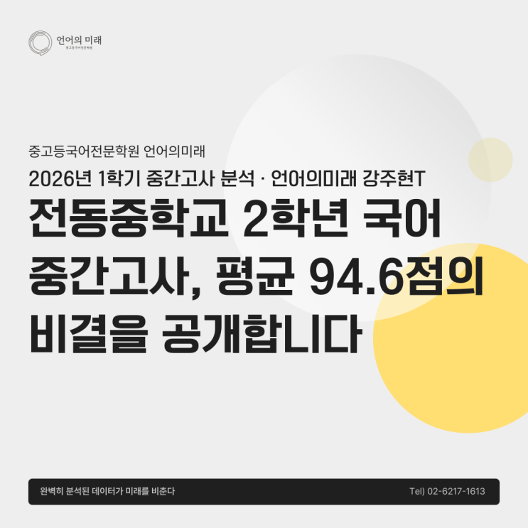 중학교 2학년 첫 중간고사, 생각보다 어려웠던 분들 많으셨죠? "개념은 외웠는데 왜 틀렸을까?" "우리 아이 점수, 어느 수준일까?" 언어의미래 강주현 선생님이 직접 분석한 2026년 전동중학교 2학년 국어 중간고사 결과와 수강생 성과를 공개합니다. ───────────────────────────────────────── ◆ 전동중학교 2학년 국어 전담 — 강주현 선생님 ───────────────────────────────────────── 이름 : 강주현 선생님 소속 : 언어의미래 · 전동중학교 2학년 국어 전담 · 전동중 시험 범위 기반 맞춤형 수업 설계 · 개별 구술 테스트 + 1:1 ....... <img src="https://blogthumb.pstatic.net/MjAyNjA0MjVfMzAg/MDAxNzc3MTE2NjczMjIz.mHCvemgIarmCy8dJFHQtNRdXqLDOjsopL8iDcL0pzTYg.G4zNSMMTRYjo_vRZcw7vJj_XaXvW61UgQWIPfED_TZsg.PNG/%BE%F0%B9%CC%A3%AF%B8%C5%BE%B2%B8%DE%C4%AB-%BA%ED%B7%CE%B1%D7-%B4%EB%B9%AE_-%BA%B9%BB%E7%BA%BB-006_%281%29.png?type=s3" />