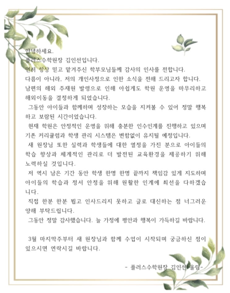 학원을 마무리한지 2주가량 지난 시점, 블로그에 너무 오래만에 글을 남기게 됩니다. 요즘은 학원에서 블로그와 인스타를 대부분 활용하지만 2018년부터 블로그와 인스타에 조금씩 소식을 전하면서 서로 소통하고 연결되면서 학원이 함께 성장하였습니다. 혼자 모든걸 하다보니 블로그를 소홀히 관리하였던게 아쉬움이 남지만 엔드라이브에 아이들과 함께한 시간들이 모두 기록되어 있어 참 다행입니다. 그 누구보다 진심과 열정을 다한 학원이라 학부모님께 알리기 일주일전부터 얼마나 마음이 무겁고 눈물을 흘렸는지, 그리고 지금까지도 서운한 마음을 다스리는 중입니다. 이제 원래의 활기있는 제 모습으로 다시 돌아와 소소한 일상과 주재원....... <img src="https://blogthumb.pstatic.net/MjAyNjA0MTJfMTIx/MDAxNzc1OTkzODc5Mjcy.SuCsEQYGMctILiaNg3tJ5PGe4zj75tji9KC3n77FwOkg.nMVH5TAS5kN84-J0Mqm9hfNMtkY03kf02HmpgN-4u24g.JPEG/KakaoTalk_20260412_203654527.jpg?type=s3" />