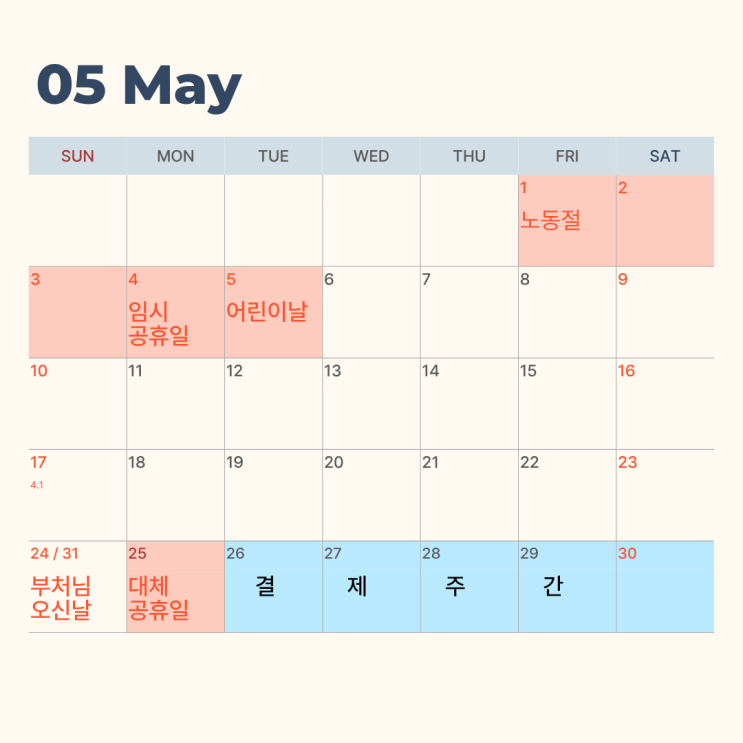안녕하세요!!! 가정의 달 5월 입니다. 5월에는 행사가 참 많습니다. 새로 법정공휴일이 된 노동절, 어린이날, 어버이날, 스승의날, 부처님 오신날 까지!! 리드앤톡 수완캠퍼스도 5월1일(노동절) / 5월4일(재량휴무) / 5월5일(어린이날) / 5월25일(대체공휴일) 4일간 쉬어갑니다. 공휴일로 인해 5월은 수업일수가 3일 부족하지만 1월, 3월, 4월, 6월까지 수업 일수보다 추가 수업을 하고 있기 때문에 전체 수업일수는 보장됩니다. ※주2-3회 학생들의 경우 수업일수가 부족할 경우 보강날짜를 잡아주세요!!!※ [교육비 결제] 리드앤톡은 1일 ~ 말일까지의 교육비를 전월 마지막 주간에 결제합니다. 본사에 매달 결제하는 프로그램비와 원생등록을....... <img src="https://blogthumb.pstatic.net/MjAyNjA0MjNfMjcz/MDAxNzc2OTM1NDA2MzYx.6gKBs18TCnl8KyO5bs54ICkNTZxBmC4-Ze1r4ontBOIg.75vdDj7NGkR_Fmdmb81fgV2JV5z1XuWIEX1VmbtLuBkg.PNG/%C1%A6%B8%F1%C0%BB_%C0%D4%B7%C2%C7%D8%C1%D6%BC%BC%BF%E4._%282%29.png?type=s3" />
