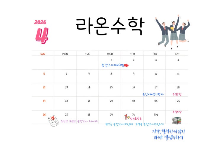 안녕하세요 라온수학입니다. 항상 자녀들의 학습에 관심과 응원을 보 내주셔서 진심으로 감사드립니다. 따뜻한 봄과 함께 4월이 시작되었습니다. 본 학원에서는 다가오는 중간고사를 위해 4월 전체를 시험대비 집중 기간으로 운영하고자 합니다. ●운영기간-4월 전기간(중간고사 집중학습) ●주요학습내용-학교멸 시험범위에 맞춘 맞춤현 진도 및 복습 핵심 개념 정리 및 유형별 문제 풀이 강화 실전대비 모의 테스트 및 오답관리 고난도 문제 집중훈련 학생별 취약 단원 집중 보완 ● 추가안내 필요시 보강 수업이 진행됩니다 시험일정에 따라 수업시간이 일부 조정될 수 있습니다 중간고사 기간동안은 꾸준한 학습 습관이 무엇보다 중요합니다....... <img src="https://blogthumb.pstatic.net/MjAyNjA0MDdfMzgg/MDAxNzc1NTMxODU3MjMx.x1P1azlDZTGp4ee1vgAYZn24aZ26EmaWQ7Jzn_Y4ouEg.d_U_oz56DRhfAbdD-t-3CBQSpwhwX3Hld-sd62q-ZzMg.JPEG/4%BF%F9%C0%CF%C1%A4-001.jpg?type=s3" />