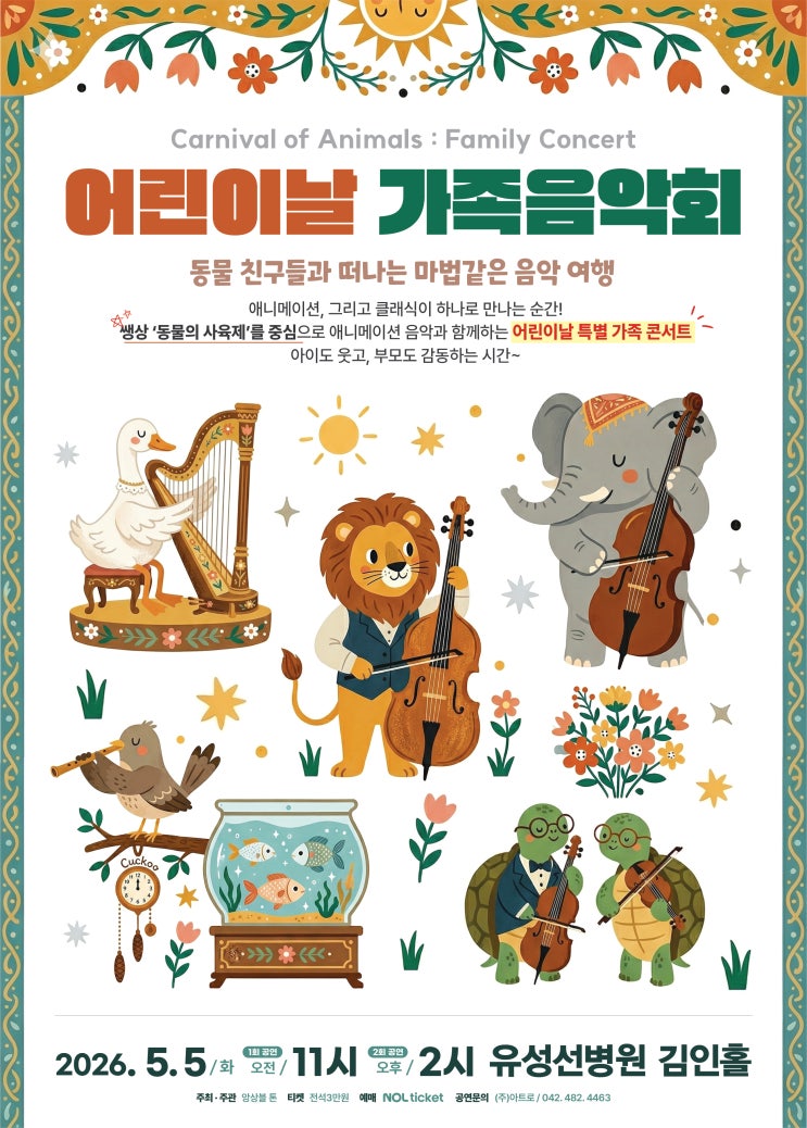 어린이날 계획 세우셨나요? 아이랑 어디 갈지 고민이라면, 5월 5일 딱 하루! 특별한 가족 음악회를 추천드려요. ✨ 이번 공연이 특별한 이유 3가지! 1. 동물의 사육제 라이브 연주 아이들이 좋아하는 사자, 코끼리, 백조가 음악으로 살아 움직여요! 동물 이야기처럼 재미있게 빠져드는 클래식의 매력을 느껴보세요. 2. 디즈니 & 지브리 인기 OST "이거 아는 노래다!" 아이들 반응 최고 알라딘부터 토토로까지, 엄마 아빠도 함께 힐링받는 감동적인 선율이 가득합니다. 3. 쉽고 재미있는 '해설형 공연' 아이들의 눈높이에 맞춘 스토리텔링이 함께해요. 지루할 틈 없는 진행으로 '아이의 첫....... <img src="https://blogthumb.pstatic.net/MjAyNjA0MjBfMTI2/MDAxNzc2NjY3MTYxMTE4.NqWXlElRi0vzk4VoReXnfg_yj3OGRmVojQbSfMiUargg._ykC79whBcKQxFj7k7UWUDS2CaXp3C93zRBNC4piAtQg.JPEG/KakaoTalk_20260329_133228664_01.jpg?type=s3" />