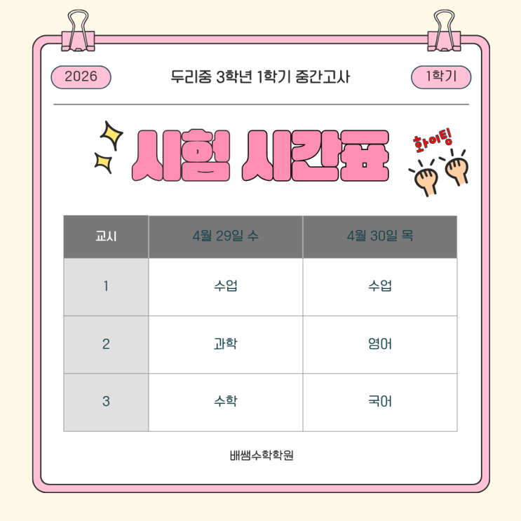안녕하세요. 배쌤수학학원입니다. 요즘 두리중학교에서도 중간고사 시험시간표가 공지되면서 아이들이 본격적인 시험 준비에 들어간 시기입니다. 시험기간이 다가오면 아이들도 긴장되고, 학부모님들 역시 마음이 바빠지실 텐데요. 2026 두리중학교 중간고사 시간표(3학년) 이제는 새로운 내용을 많이 공부하기보다 지금까지 해온 내용을 얼마나 잘 정리하느냐가 중요한 시기입니다. 특히 수학은 그동안 쌓아온 개념과 연습이 바탕이 되는 과목이기 때문에 지금 시점에서는 틀린 문제를 다시 풀어보고, 헷갈리는 개념을 정리하는 것이 가장 효과적인 공부 방법입니다. 배쌤수학학원도 마지막까지 아이들과 함께하며 흔들림 없이 준비할 수 있도록....... <img src="https://blogthumb.pstatic.net/MjAyNjA0MjFfMTk3/MDAxNzc2NzU0ODk1MzI5.bbkJwenOX4rvVPvEwK-VyE-_blw6zAiCb9KdaYOnPbIg.2znbwmrs9xc9d7pOJPSEzPdQvlDy6Tsg8Vt4Fy-zSokg.PNG/%B5%CE%B8%AE%C1%DF3.png?type=s3" />