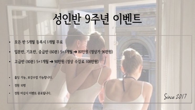 9주년 이벤트 진행합니다. (주말반은 6개월 등록시 할인 안내 드리오니 문의 부탁드려요! ) ⠀ ⠀ ⠀ ⠀ ⠀ location 유성구 죽동 707-5 ⠀ studio 042.824.7060 kakao bona1004v 방문상담은 예약 후 방문 부탁드려요. ⠀ ⠀ ⠀ ⠀ #대전발레 #유성발레 #둔산동발레 #도안동발레 #죽동발레 #대전발레학원 #대전성인발레 #대전유아발레 #대전취미발레 #죽동발레학원 #유성발레학원 #위드발레학원 #죽동 #대전무용 #대전무용학원 #ᄇ....... <img src="https://blogthumb.pstatic.net/MjAyNjA0MjFfMjY5/MDAxNzc2NzgxNjU5ODUx.cMkROsZG-nlTPMobDkjm9_dF1KHm9zbaLbyk0We84Vsg.sopar5AJ3BkRinYYsV4vCeB7sD0hxvz2ioOqSsOagDUg.JPEG/IMG%A3%DF1697.jpg?type=s3" />