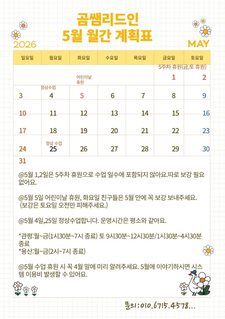 5월 곰쌤리드인 일정입니다(리드인관평용산)