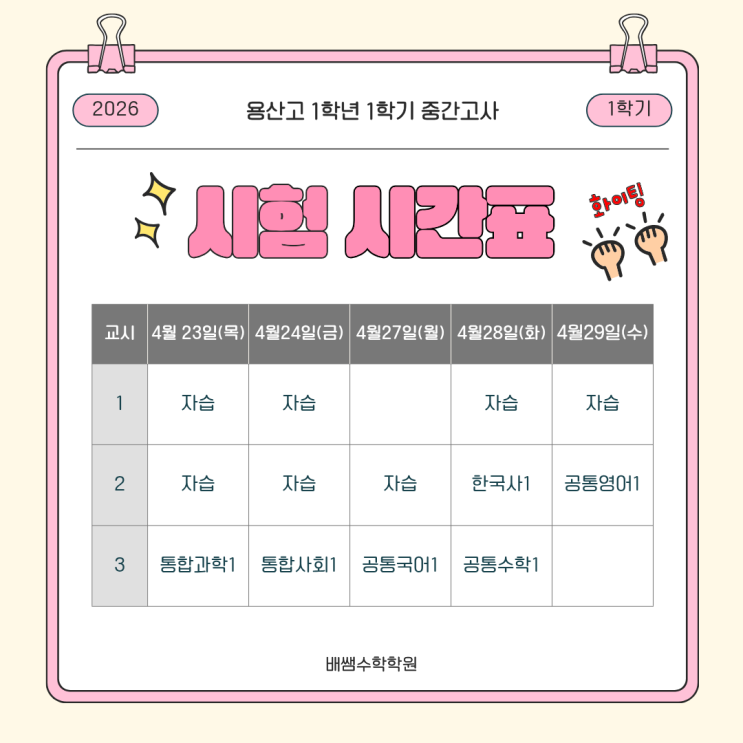 안녕하세요. 배쌤수학학원입니다. 요즘 용산고등학교에서도 중간고사 시험시간표가 발표되며 학생들이 본격적인 시험 대비에 들어간 시기입니다. 고등학교 시험은 중학교 때보다 과목 난이도와 학습량이 크게 늘어나기 때문에 시험기간이 다가올수록 학생들의 긴장감도 함께 높아지게 됩니다. 이 시기에는 새로운 내용을 무리하게 늘리기보다는 지금까지 학습한 내용을 얼마나 정확하게 정리하고 활용할 수 있는지가 중요합니다. 특히 수학은 단순히 문제를 많이 푸는 것보다 개념을 정확히 이해하고 자주 틀리는 유형을 반복해서 점검하는 것이 점수 향상에 훨씬 효과적입니다. 시험 직전일수록 ‘불안해서 계속 새로운 문제를 푸는 것’보다 ‘....... <img src="https://blogthumb.pstatic.net/MjAyNjA0MTRfMTEg/MDAxNzc2MTYyMTc4NDM0.Rp3cBMti1O6ifsUAlCIJa2NTH7qPOemfUm846FKqUIsg.v0MEvtcmezaG0xi-v6En8YKUElo-md7Y7GvyjAdiDu0g.PNG/%BF%EB%BB%EA%B0%ED1%C7%D0%B3%E2_%C1%DF%B0%A3%B0%ED%BB%E7_%BD%C3%B0%A3%C7%A5.png?type=s3" />