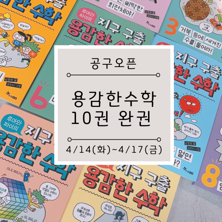 ✔️ 재미있는 수학책 없을까요? 사실 수학책 중에서 재미있는 수학책을 찾는게 쉽지 않죠! 그런데 이 책은 아이들이 너무 재미있게 봐요!! "이루다쌤이 공구하는 책들 믿고 사요" 라고 말씀해주시는 분들이 점점 많아지더라구요! 저희 첫째도 학교에 가지고 다니면서 아침시간에 읽고 있어요 ㅋㅋ 1년만에 재오픈! 드디어 용감한 수학 10권 완권이 되었어요!! 완권이 되기까지 기다렸어요! (이번에 10권 모두 구매하신 분들께는 선물까지 있습니다!!) ✅ 공구 기간 4/14(화)~4/17(금) ✅ 공구가 ✔ 루이와 파이의 지구 구출 용감한 수학 (전 10권) 135,000-> 94,500원 ✔ 1~4권 세트 54,000-> 37,800원 ✔ 5~10권 세트 67,....... <img src="https://blogthumb.pstatic.net/MjAyNjA0MDNfMTg5/MDAxNzc1MTc4MjQ4ODU1.ucJqTFpxqIjvhLbgc_a9ZDns75yHq8XQYXun00dIWIAg.YCyMa_Mdgxlt8nx6wdIk8zp9JxHafZ2aNP8iU4S0RH4g.PNG/KakaoTalk_20260403_094306510.png?type=s3" />