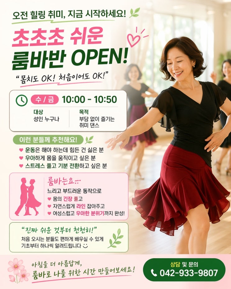 오전 힐링 취미, 지금 시작하세요 초초초 쉬운 룸바&자이브 OPEN! “몸치도 OK! 처음이어도 OK!” ✔ 대상 : 성인 누구나 ✔ 시간 : 수 / 금 오전 10:00 - 10:50 ✔ 목적 : 부담 없이 즐기는 취미 댄스 ✨ 이런 분들께 추천해요 - 운동은 해야 하는데 힘든 건 싫은 분 - 우아하게 몸을 움직이고 싶은 분 - 스트레스 풀고 기분 전환하고 싶은 분 룸바&자이브 느리고 부드러운 동작으로 몸의 긴장 풀고 자연스럽게 라인 잡아주고 여성스럽고 우아한 분위기까지 완성! 활동적인 자이브 “진짜 쉬운 것부터 천천히!” 처음 오시는 분들도 편하게 배우실 수 있게 기초부터 하나씩 알려드립....... <img src="https://blogthumb.pstatic.net/MjAyNjA0MTdfMTcx/MDAxNzc2Mzg2MTc5MjY3.mHXm9h8AK7wgLuEcRIdtkFc-Y_ixJO5scjB9DwZN28og.r7MTGJTGxBMEbC36a4TFLGt800_O66Q-bXXUMU5X-lIg.JPEG/E48C0DB0%A3%ADE963%A3%AD4AF3%A3%ADB4AD%A3%ADC3CD00D684EC.jpg?type=s3" />