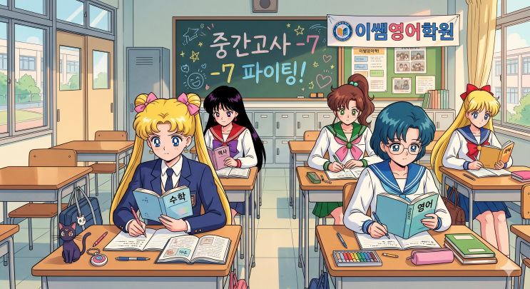 중간고사가 벌써 일주일 앞으로 다가왔습니다. D-7 이라는 글자가 주는 긴장감, 우리 학생들의 어깨 위에 놓인 부담감을 저또한 너무 잘 알고있습니다. 긴장과 부담이 있다는건 그만큼 이번 중간고사를 위해 열심히 공부를 해왔기 때문이라 생각합니다. 그런 학생들을 위해 이쌤영어학원은 최고,최선,최대의 대비하고 있습니다. 이쌤영어학원의 "치밀한 분석과 꼼꼼한 관리" 지역 학교 맞춤형 기출 분석: 각 학교의 지난 몇 년간 기출 문제를 철저히 분석하여, 시험 출제 경향과 핵심 포인트들을 파악하고 있습니다. 교과서 및 외부 지문 완벽 분석: 교과서뿐만 아니라 학교별 외부 지문(모의고사, 부교재 등)까지 꼼꼼하게 분석하여 변....... <img src="https://blogthumb.pstatic.net/MjAyNjA0MTlfMjU3/MDAxNzc2NjA2NjQxNTU4.w48wMxkXaxJ5E6xxYsB10NAcHk9cPow4HThFBK-fnZEg.VXt3195cZXdpAoC1NWdSWkR4s5wA_1ZgoOWE7afJrJgg.PNG/Gemini_Generated_Image_ll62hsll62hsll62.png?type=s3" />