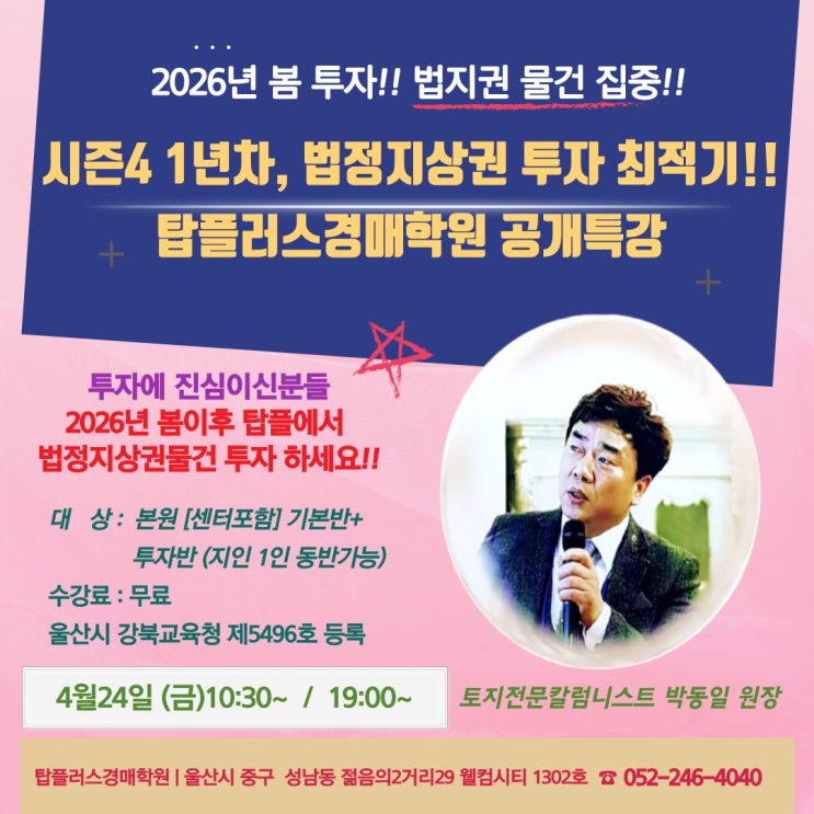 2026년 봄 이후 경매, 공매 토지투자 지금이 기회다. 법정지상권 공개특강 탑플러스경매학원 박동일원장 #탑플러스경학원 #토지전문칼럼니스트 #박동일원장 #울산법원경매 #울산아파트경매 #법정지상권경매 #공유지분경매 <img src="https://blogthumb.pstatic.net/MjAyNjA0MTNfMzAg/MDAxNzc2MDU0Njg2NTQy.lV5oHC0BpbFI01jWIshOTrT2VZ-nRYFWFuNVWPmm1oUg.ixTX7VHUgMVRTK5i6NIsLVNO-KelZzZZq-UfNnfYdlog.PNG/%B9%FD%C1%F6%B1%C7%B1%E2%BA%BB%B9%DD%C6%AF%B0%AD-001.png?type=s3" />