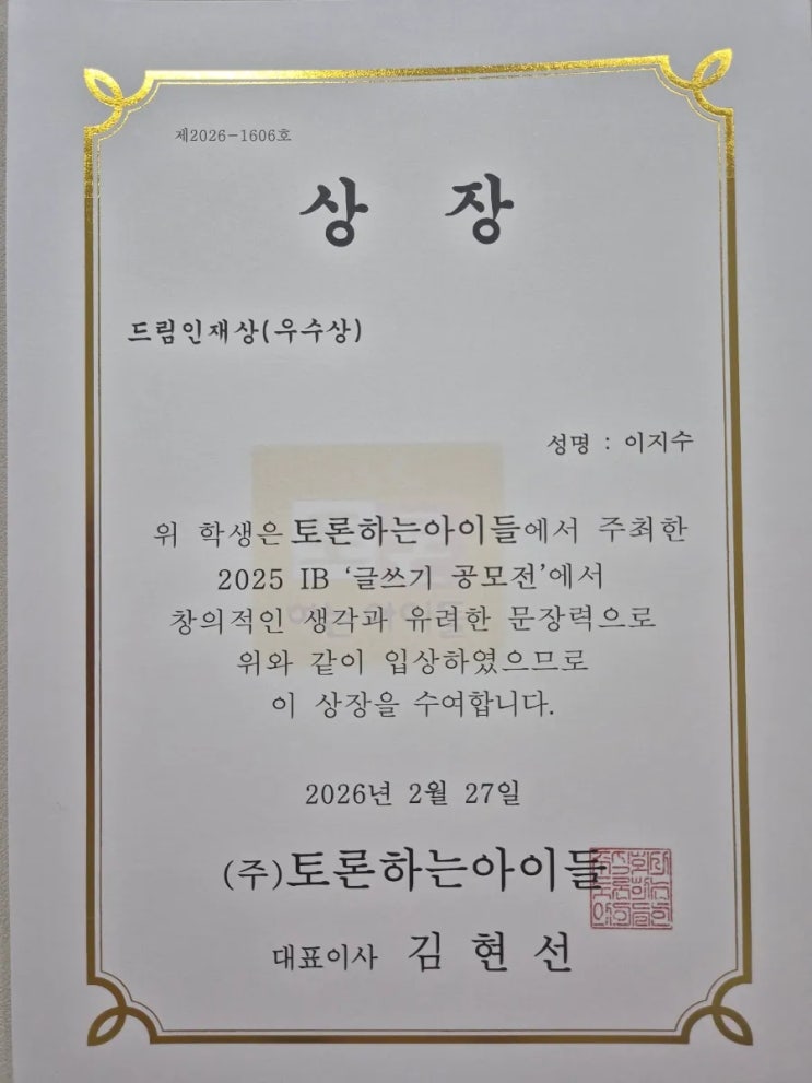 안녕하세요 남외지앤비 영어 수학 독서논술 학원입니다. 토론하는 아이들에서 공모전 당선이 되어 포스팅합니다. 글을 쓴다는 것은 생각의 폭을 넓히고 사고력 향상을 위한 좋은 훈련이기도 합니다. 글쓰기가 강조되는 요즘에 문해력과 사고력을 키울수 있는 독서 훈련!! 누구나 할 수 있는 것 같아도 쓰기는 요령과 배움이 뒷 받침이 되어 있어야 자연스런 글 표현이 나올 수 있습니다. 25년 글쓰기 대회에서 상을 받았어요. 글쓰기는 책을 꾸준히 읽고 글쓰기 훈련을 했을때 글쓰기가 나옵니다. 수행평가를 칠 때엔 이 글쓰기가 잘 되어야 글을 매끄럽게 쓸 수가 있습니다. 수업 시간에 언제나 발표를 잘 하고 자기 생각을 잘 표현하는 학생들....... <img src="https://blogthumb.pstatic.net/MjAyNjA0MTRfMjc0/MDAxNzc2MTc1OTIzODI4.BAXPMUHO2vFEtLAjzhH4vWq0ZEchBHVfFpwcCSFVubog.hgIiauK_IsN9aPqKywm7iFIWH-CbL5iKwJoHJbJRLIIg.JPEG/900_20260402_125213.jpg?type=s3" />