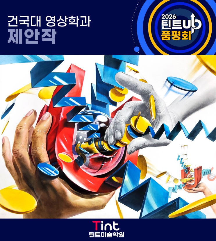안녕하세요! 울산틴트미술학원입니다. 오늘은 건국대학교 영상학과의 기초디자인 기출 문제를 분석하고, 틴트미술학교의 강사제안작들을 소개해드리려고 합니다. 영상학과는 일반적인 기초디자인보다 '공간의 연출'과 '주제 해석 능력'을 중요하게 보는데요. 이번 문제는 어떤 핵심 포인트를 담고 있는지 함께 살펴볼까요? 합격을 부르는 포인트 3가지 1. 평면의 입체적 재해석 단순한 종이 조각이 아니라, 'U'자형 자석이나 금속 트랙, '지그재그' 형태의 계단이나 스프링, '원' 형태의 구슬이나 코인 등으로 물성을 부여하는 능력이 필요합니다. 2. '환희'를 보여주는 연출....... <img src="https://blogthumb.pstatic.net/MjAyNjA0MTRfNjIg/MDAxNzc2MTY4ODI0ODEx.mYdAUeUOn5_-CzXKHs7es1O7g9p4DKlxdVYRB_D_kvEg.sZGxx4IKBcZZbvLu5Lq9B2PlyPvQm5pw8UiWlyIp0HYg.JPEG/KakaoTalk_20260325_153013545_01.jpg?type=s3" />