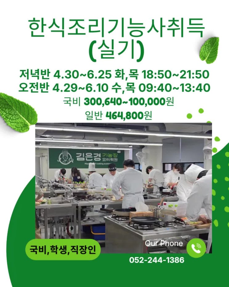 4월29,30개강 수목오전반/화목저녁반 한식조리기능사취득(실기) 한식조리기능사 실기, 혼자 준비하기 어려우셨나요? 김은경 기능장 요리학원에서는 시험 기준에 맞춘 실습 중심 수업으로 초보자도 합격까지 갈 수 있도록 지도합니다. 수업 일정 ✔️ 저녁반 기간 : 4.30 ~ 6.25 요일 : 화, 목 시간 : 18:50 ~ 21:50 ✔️ 오전반 기간 : 4.29 ~ 6.10 요일 : 수, 목 시간 : 09:40 ~ 13:40 수강료 ✔️ 국비지원 과정 자비부담 300,640원 → 100,000원 (대상따라상이함) ✔️ 일반 수강 464,800원 이런 분께 추천합니다 ✔️ 요리 처음 시작하는 초보 ✔️ 자격증 취득이 목표인 분 ✔️ 취업 / 창업 준비하는 분 ✔️ 시험 레시피 반....... <img src="https://phinf.pstatic.net/image.nmv/blog_2026_04_18_2984/cKgH5kZy3p_01.jpg?type=f480x480" />