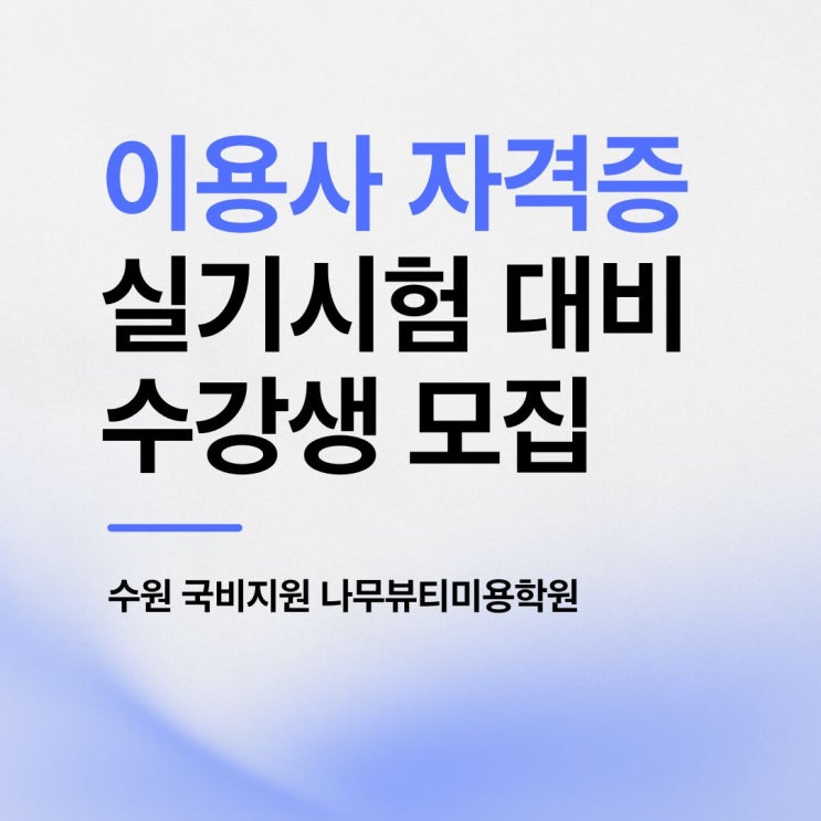 수원 이용사자격증 실기시험 대비반 모집 국비교육 6월 24일 개강 안녕하세요. 수원 팔달구에 위치한 헤어미용 전문 교육기관 나무뷰티미용학원입니다. 오늘은 정말 문의가 많았던 본원의 이용사 자격증 실기시험 대비과정을 소개해드리겠습니다. 이용사 자격증 실기시험 4차, 지금 준비해야 합니다. 이용사 자격증 실기시험 4차 일정이 2026년 11월 14일부터 12월 2일까지로 확정되었습니다. 시험까지 충분한 준비시간이 필요한 만큼, 지금 바로 시작하시는 것을 추천드립니다. 이용사 자격증, 미용사에게도 필요한가요? 이용사 자격증에 대해 많은 분들이 이런 질문을 하시는데요. "헤어디자이너인데 이용사 자격증이 필요한가요?" 결....... <img src="https://blogthumb.pstatic.net/MjAyNjA0MjlfMTY4/MDAxNzc3NDQ2Mjc5NTA4._aKNdmBqX07C1Q1qfBqzlV_cwAvnqLDdkEUnYCO3eH8g.3y5wbwo-XfwsNymafevwp99K63U96s3ealkyPmBf1E8g.JPEG/%BA%ED%B7%CE%B1%D7_%BD%E6%B3%D7%C0%CF.jpg?type=s3" />